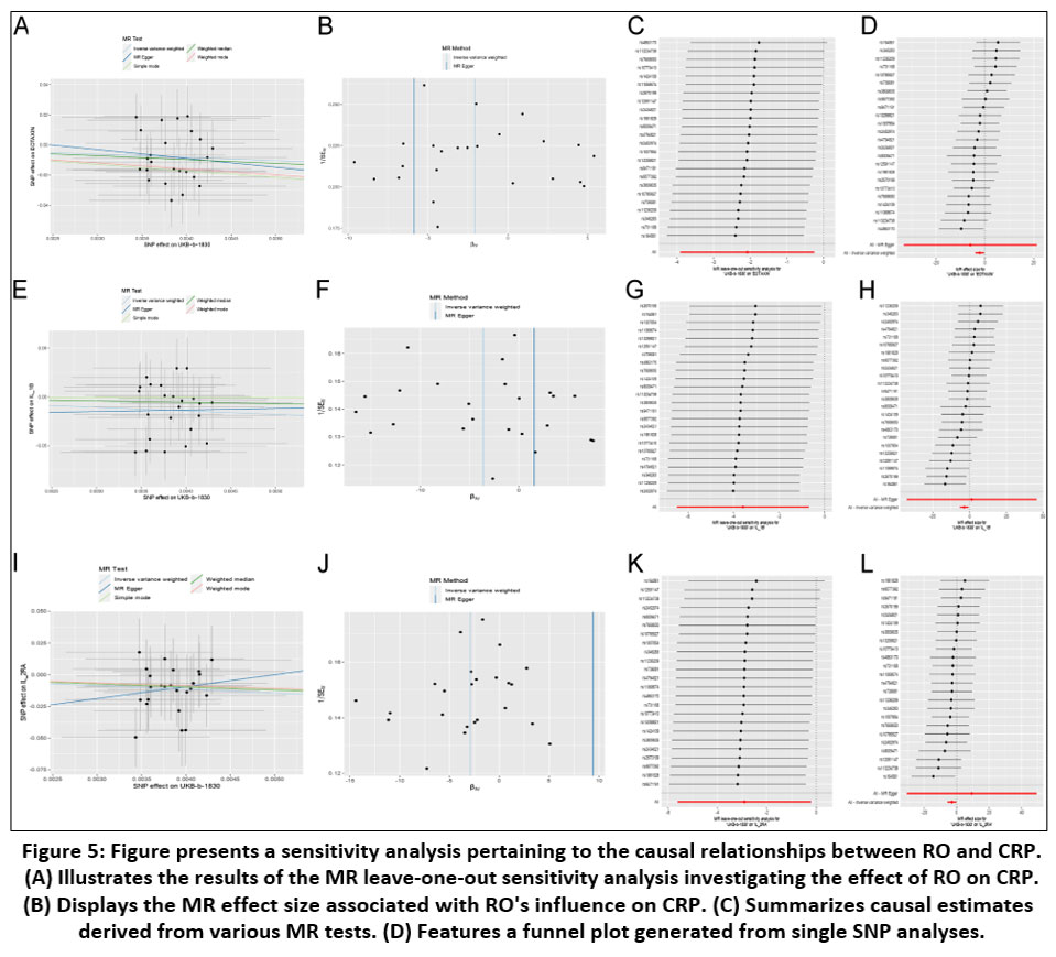 To evaluate the strength of the causal association between RO and CRP, a leave-one-out sensitivity analysis was performed for every SNP. Our findings revealed that the outcomes consistently aligned on one side of the zero line, regardless of the absence of any SNPs (Figure 5A). In addition, we illustrated the effect sizes of both IVW and MR-Egger, which appeared to match the significance that was found (Figure 5B). Furthermore, during the entirety of the MR Tests, the patterns were generally constant and statistically significant (Figure 5C). In conclusion, the funnel plot analysis revealed that the individual SNPs were distributed in a symmetrical manner on both sides of the vertical line in the IVW and MR-Egger assessments (Figure 5D).