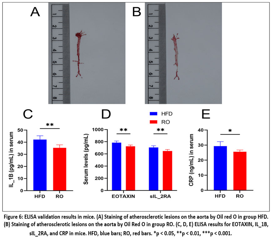 Figure 6: ELISA validation results in mice. (A) Staining of atherosclerotic lesions on the aorta by Oil red O in group HFD. (B) Staining of atherosclerotic lesions on the aorta by Oil Red O in group RO. |