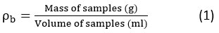 To determine the bulk density (ρb), the wadi samples of known mass (kg) were placed in a graduated cylinder of known volume (m3). The volume occupied by the samples was recorded. The mass of the samples was measured with the help of an electronic balance (least count of 0.001 g). The bulk density was then calculated as: