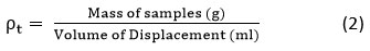 The true density (ρt) was determined by the seed replacement method. The rape seed was filled in a cylinder up to a known volume (m3). Wadi samples were filled in the cylinder, and the displacement (m3) of the level of rapeseed was recorded. The true density is again recorded as: