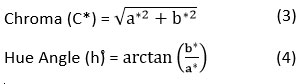 Color of the wadi samples was measured using a HunterLab MiniScan XE Plus colorimeter (Model 45/0-L, USA) based on L*, a*, and b* values. The instrument was calibrated with standard black and white tiles, and readings were taken under a D-65 illuminant with a 10° observer angle. Samples were placed in petri dishes to prevent light transmission. Chroma and Hue Angle were calculated from the L*, a*, and b* with the help of equations 3 and 4, respectively.