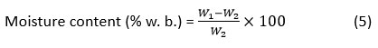 Where, moisture content was measured on wet basis(wb), W1 is the weight of sample (g) and W2 is the weight of sample after drying (g)