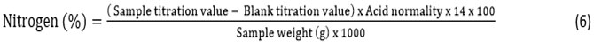 The protein content in the wadi samples was estimated using the Kjeldahl technique, following the AOAC8 guidelines. In this method, the sample undergoes digestion with concentrated sulfuric acid and a catalyst, which transforms nitrogen present in peptide bonds into ammonium sulfate. Ammonia is released through steam distillation in an alkaline medium and absorbed in a boric acid solution, forming ammonium borate, which is then quantified by titration using a standard acid. The nitrogen content of the sample can be calculated as follows: