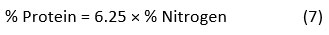 Protein content was determined by applying a specific conversion factor to the measured nitrogen content. The protein content of wadi samples was calculated using a conversion factor of 6.25 with the formula: