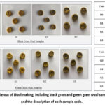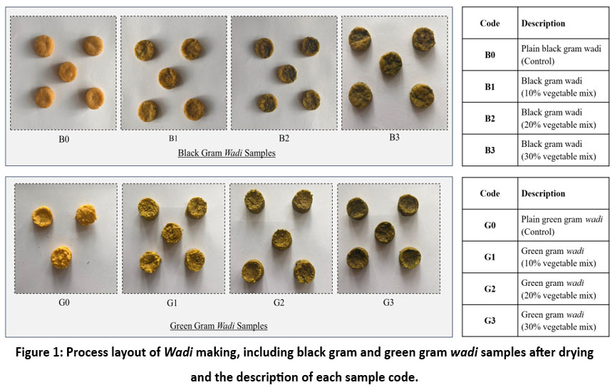 Figure 1: Process layout of Wadi making, including black gram and green gram wadi samples after drying and the description of each sample code.