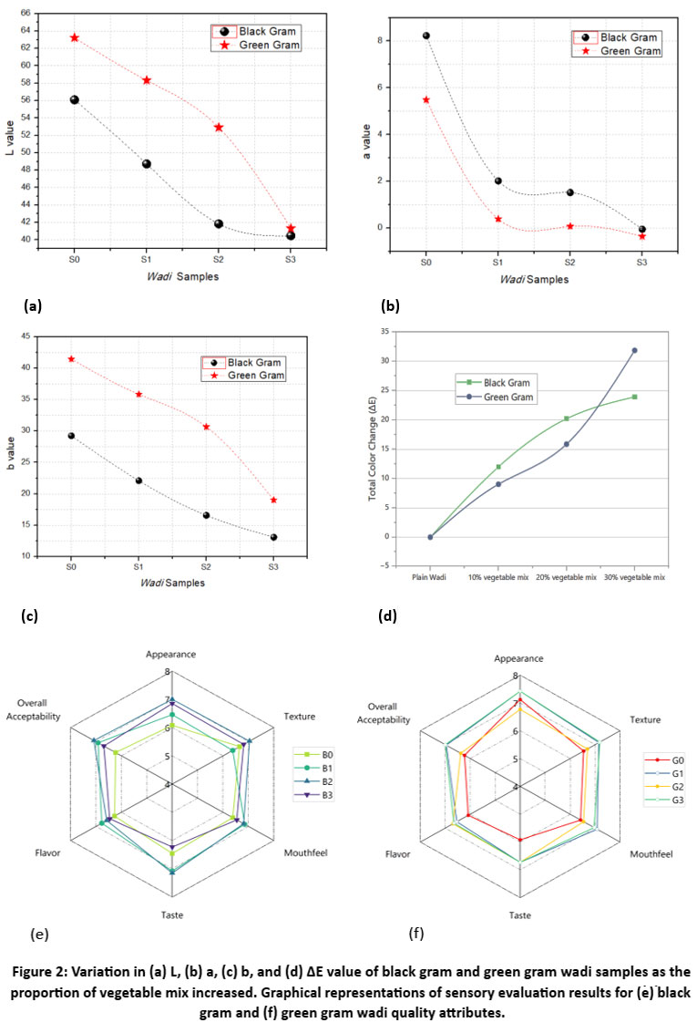 Figures 2 (e) and (f) represent the sensory values for each sample in the radar plot based on six quality attributes: appearance, texture, taste, mouthfeel, flavor, and overall acceptability. After conducting the sensory analysis, it was found that the incorporation of vegetable mix had a notable impact on the sensory characteristics of both types of wadis. In black gram wadi, the control sample (B0) showed moderate ratings across all attributes, whereas samples with increasing vegetable mix (B1, B2, and B3) showed progressive improvements in appearance, texture, and overall acceptability. The highest ratings were observed in B3 (30% vegetable mix), suggesting that the addition of vegetables enhanced sensory properties, particularly in texture and visual appeal. Similarly, in green gram wadi, the control sample (G0) demonstrated relatively good ratings; however, it scored lower in taste and mouthfeel compared to vegetable-incorporated samples. The sensory scores for appearance, texture, and overall acceptability increased with higher vegetable content, with G3 (30% vegetable mix) exhibiting the most favorable attributes. The overall trend indicated that the addition of vegetable mix in black gram and green gram wadis contributed positively to the sensory properties. Thus, while plain Wadis are traditionally prepared in countries like India, incorporating vegetables such as spinach and radish can enhance their nutritional profile, improve sensory attributes, and offer additional health benefits, making them a more wholesome and appealing food option.