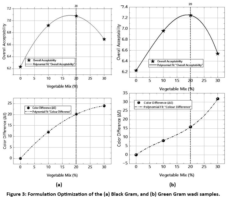 The formulation of spinach and radish (the ratio 1:1) in wadi was optimized based on color and sensory property analysis. The vegetable mix of 0%, 10%, 20%, and 30% in black gram and green gram wadi was tested for overall acceptability and total color change value (ΔE) (Figure 3). A second-order polynomial regression was applied to analyze the trend and determine the optimized vegetable incorporation level. The fitted quadratic models provided an excellent fit to the experimental data for the black gram wadi as shown in Figure 3 (a), as indicated by the high coefficients of determination (R² = 0.99), for overall acceptability and total color change. The ANOVA results showed that the regression coefficients were statistically significant (p < 0.05). The fitted curve revealed a parabolic pattern for overall acceptability, with the highest point occurring at approximately 20% vegetable mix, followed by a decrease. An increasing trend was observed in total color change with vegetable mix percentage.