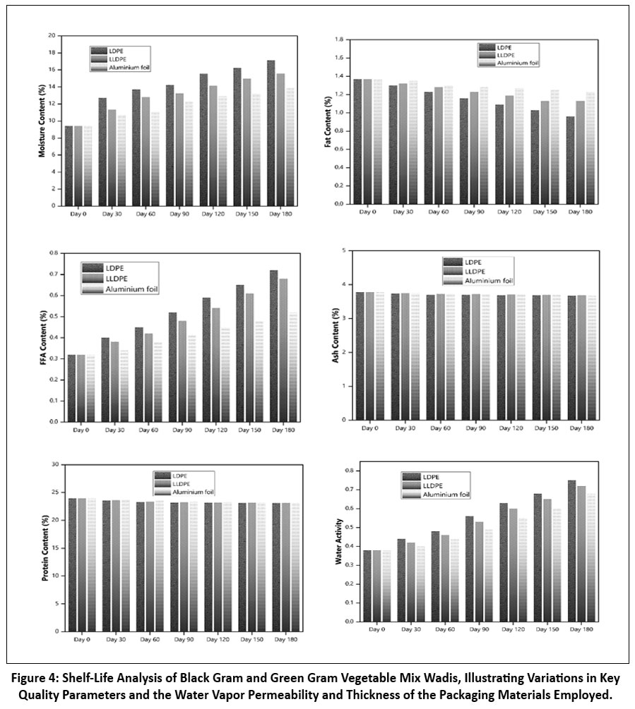 The shelf-life study of black gram and green gram wadi in different packaging materials was done by observing the changes in various properties like moisture content, fat content, protein content, ash content, Free fatty acid (FFA) content, and water activity as shown in Figure 4.