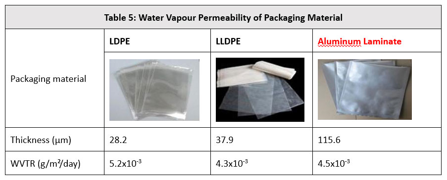 Table 5: Water Vapour Permeability of Packaging Material