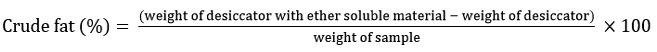 The fat content in a sample is determined by extracting ether-soluble materials using a Soxhlet apparatus. A dried sample (2–3 g) is placed in a thimble, and the extracting solvent used was petroleum ether (boiling point 40–60°C). The solvent is continuously vaporized and condensed, allowing it to flow over the sample for 16 hours at a rate of 2–3 drops per second. After the extraction process, the ether is removed using a hot water bath. The flask is then dried in an oven at 105°C for 30 minutes, cooled in a desiccator, and subsequently weighed. The crude fat percentage is calculated using the formula: