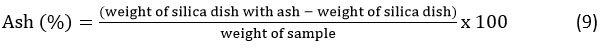 A 2.0 g of the sample was ignited at 600°C for 6 h in a muffle furnace. The crucible and ash were cooled in a desiccator and weighed. Ash content (%) was calculated as: