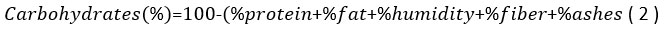 For proximate analysis of the biscuits, AOAC standard analytical methods33 were followed for moisture content (925.09), total ash (923.03), crude protein (960.52), crude fat (920.85), crude fiber (993.21). Carbohydrates were calculated by difference according to equation 2.