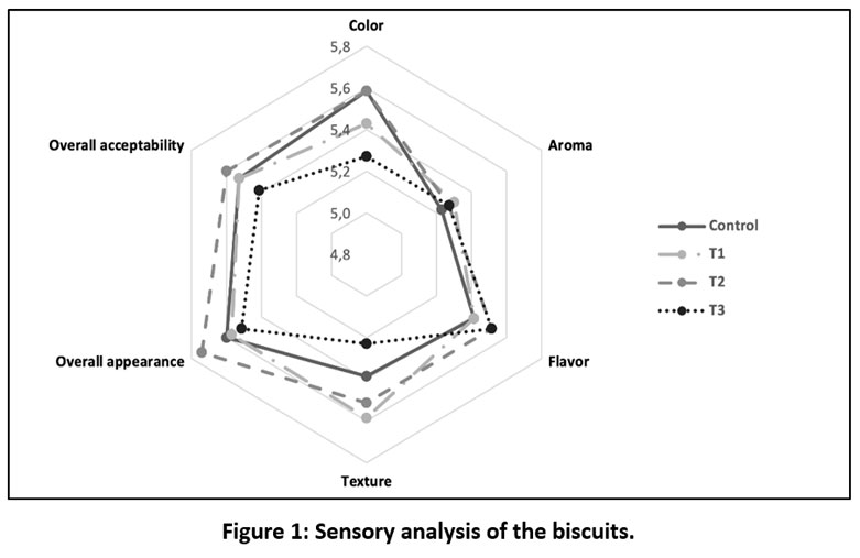 In relation to adhesiveness, no statistically significant differences were observed; however, Table 6 shows that T2 presented a value of −12.88, suggesting that these biscuits were stickier. This behavior could be related to the starch present in yam flour, which, upon gelatinization during baking, may produce dough with higher moisture and stickiness.64 This, in turn, could also explain the lower hardness observed in this treatment.