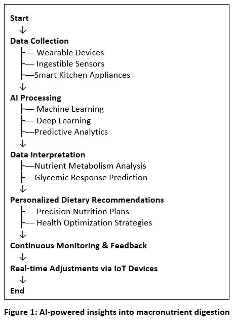 ABSTRACT:This review synthesizes current advancements and applications of these technologies in the context of human digestion and personalized nutrition. The integration of Artificial Intelligence (AI) and the Internet of Things (IoT) in nutritional science has transformed dietary monitoring, digestion research, and precision nutrition. AI-driven models, including machine learning and deep learning, enable accurate predictions of nutrient metabolism, glycemic responses, and dietary impacts on health. IoT devices, such as ingestible sensors, wearable trackers, and smart kitchen appliances, facilitate real-time monitoring of food intake, metabolic responses, and digestive processes. These technologies enhance research accuracy, optimize food formulation, and support personalized dietary recommendations. Additionally, IoT-driven automation improves food production and safety, reducing waste and enhancing sustainability. Collectively, these tools have demonstrated the potential to improve dietary adherence, optimize metabolic outcomes, and inform public health strategies. However, challenges related to data security, interoperability, and ethical concerns must be addressed for broader implementation. As AI and IoT continue to evolve, their role in nutritional science will drive innovations in food technology, precision health, and public health initiatives, offering more effective and individualized dietary interventions. Future research should aim to integrate multi-sensor data streams and AI-driven analytics for real-time, adaptive nutrition interventions.