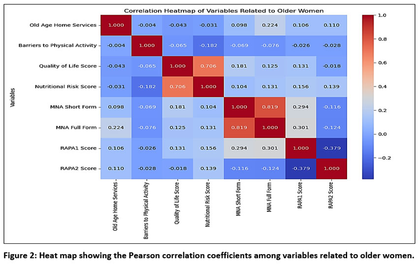 Figure 2: Heat map showing the Pearson correlation coefficients among variables related to older women. |