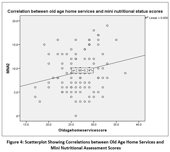 Figure 4: Scatterplot Showing Correlations between Old Age Home Services and Mini Nutritional Assessment Scores |